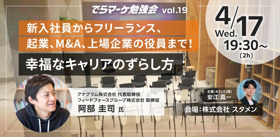 でらマーケ勉強会19回目は「新入社員からフリーランス、起業、M&A、上場企業の役員まで!幸福なキャリアのずらし方」というテーマで、アナグラム株式会社代表取締役/フィードフォースグループ株式会社取締役の阿部圭司さんにご登壇いただきました!